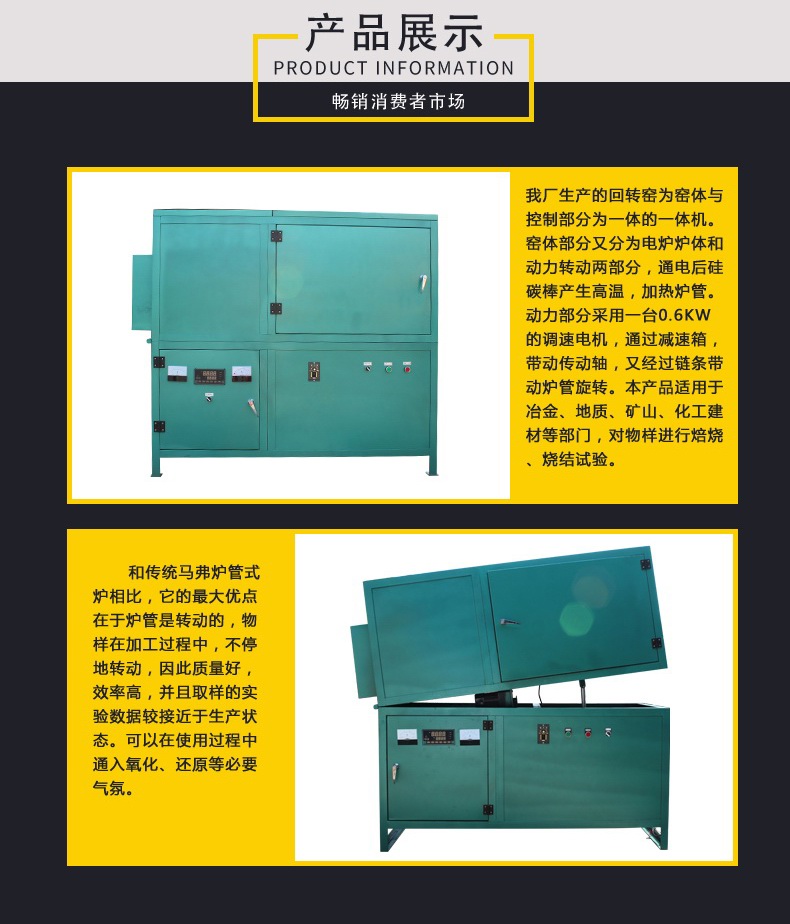本產(chǎn)品適用于冶金、地質(zhì)、礦山、化工建材等部門,對物樣進行焙燒、燒結(jié)試驗。和傳統(tǒng)馬弗爐管式爐相比,它的最大優(yōu)點在于爐管是轉(zhuǎn)動的,物樣在加工過程中,不停地轉(zhuǎn)動,因此質(zhì)量好,效率高,并且取樣的實驗數(shù)據(jù)較接近于生產(chǎn)狀態(tài)。可以在使用過程中通入氧化、還原等必要氣氛。